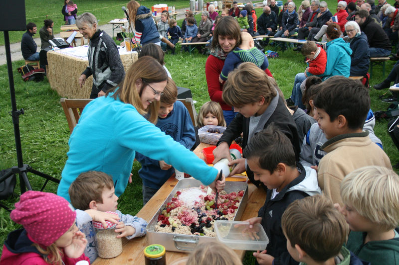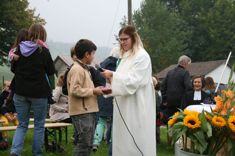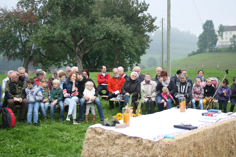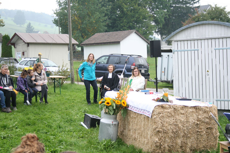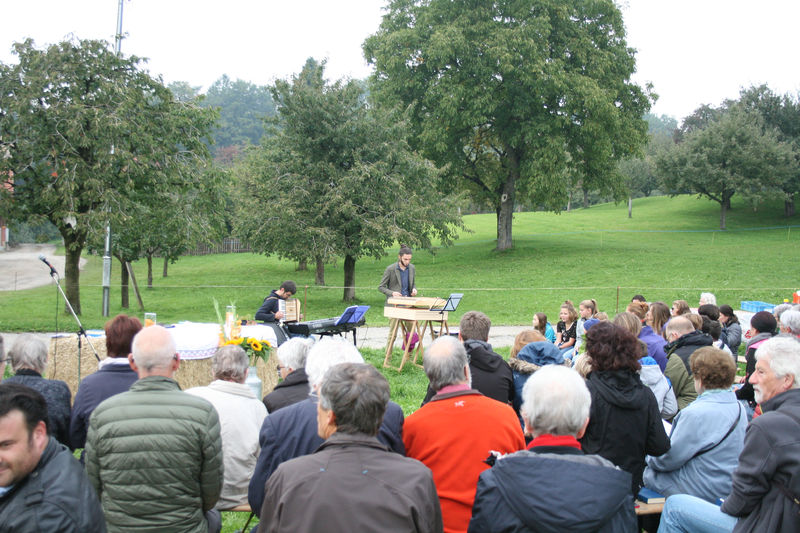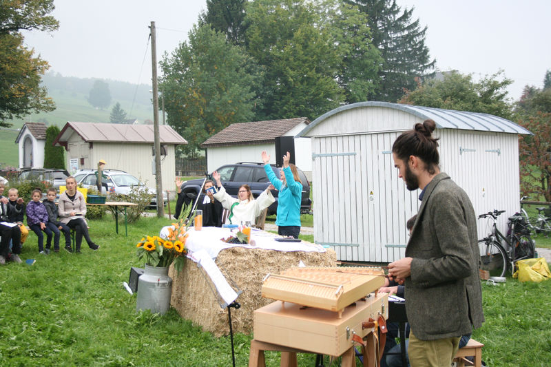 Auch dieses Jahr war uns das Wetter wieder gewogen, als die Kirchen St. Fiden, Grossacker, Neudorf, Stephanshorn und Halden wieder miteinander auf einem der Bauernhöfe in unseren Quartieren Erntedank gefeiert haben. Diesmal ging es auf die Hueb. Familie Huber hat uns ermöglicht, auf ihrem Hof den Gottesdienst zu feiern. Gross und Klein sind gekommen, um ihrem Dank für all das, was uns die Natur schenkt, Ausdruck zu verleihen. So wie es viele verschiedene Bestandteile aus der Natur braucht, um ein Birchermüesli herzustellen, braucht die Kirche verschiedenste Menschen, um Leib Christi zu sein. Der diesjährige Erntedankgottesdienst auf der Hueb war ein wunderbares Erlebnis für Gross und Klein. Die Musik von Elias Menzi am Hackbrett und Alexander Sennhauser am Klavier und am Akkordeon verhalf bei so manchem, dass die sich die gute Stimmung noch weiter vertiefte.