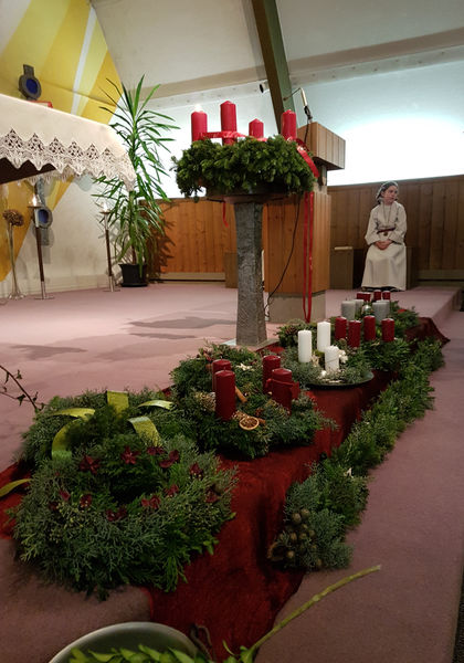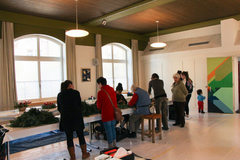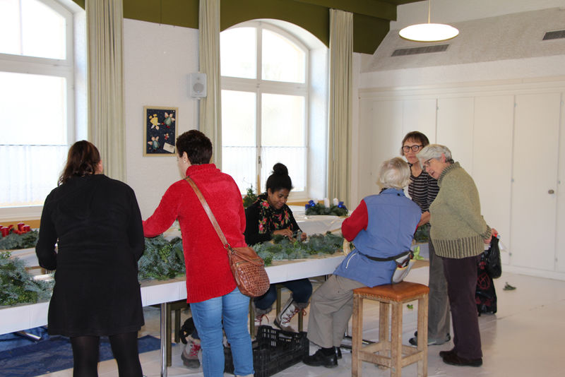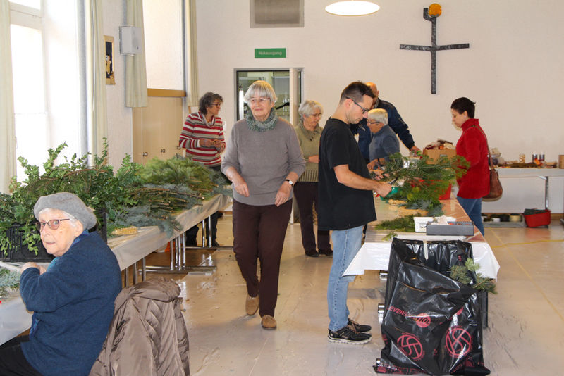 So oder so ähnlich klang es während der Adventsbinderei in St.Otmar. Zu Beginn der Adventszeit, am 2. Dezember fanden sich Menschen vom Kleinkind bis zum Senior im Pfarreisaal ein um bei der ersten Adventsbinderei dabei zu sein. Während die einen einen Kranz herstellten, waren andere damit beschäftigt, ein Gesteck zu machen. Es hatte eine Unzahl an Dekomaterial und Grünzeugs zur Verfügung, so dass es für jeden das passende hatte. Die gemütliche ruhige Atmosphäre war ein würdiger Start in den Advent. Die Kränze und Gestecke wurden während dem Sonntagsgottesdienst im St. Otmar (siehe Bild) und während dem Familiengottesdienst am Samstag Abend im Riethüsli (siehe Bild) gesegnet.